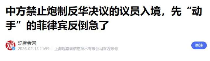 面对菲方的无理挑衅,中方的反制来得又快又准 ——2026 年 2 月 12 日,中国驻菲律宾大使馆发表声明,宣布禁止 16 名参与炮制反华决议的菲方官员进入中国内地及港澳地区,直白表态 “你不欢迎我们,我们也不欢迎你;你有攻击我们的自由,我们就有反击的权利”。