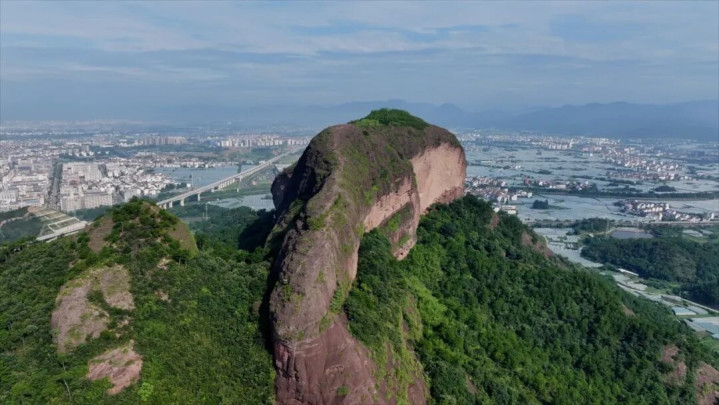 官岩山位于浦江县黄宅镇的浦阳江南岸,属于典型的丹霞地貌,海拔391米。在翠绿枝叶的掩映中,巨大的山石仿佛拔地而起,静静地在那里注视着整个浦江。它没有马岭古道的奇石伫立,也不似仙华山的高耸入云,却以原始粗犷的山石地貌,悄然成为浦江人心中理想的登山去处。