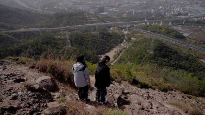 最终,在山风的呼啸声中,我们站上官岩山的山顶。视野豁然开朗,放眼远眺,浦江景色一览无余:阡陌纵横,房屋林立,良田水塘点缀其间,四周青山环抱盆地,偶尔有高铁如白色游龙般飞驰而过。从山顶向下望,南坡是如刀劈般的绝壁陡崖,北坡的乱石则圆润突出,形态各异。