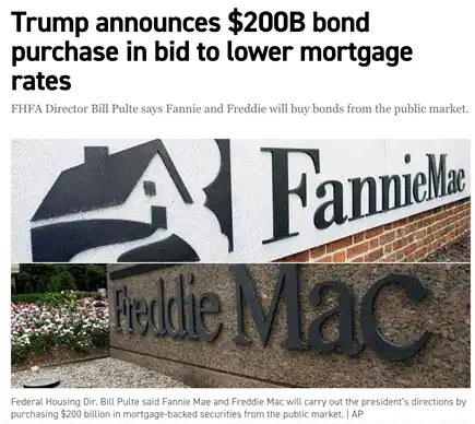 特朗普是个地产商人,他知道如何为房产融资。他的新命令是让房地美和房利美(‘两房’)动用其资产负债表上的资本购买 2000 亿美元的抵押贷款支持证券(MBS)。这是美元流动性的净增加。如果成功,特朗普不会止步于此。通过降低抵押贷款利率来推高房市,将让美国人能够通过房屋净值贷款。这种财富效应会让选民在投票日心情大好,转而支持共和党。更重要的是,这创造了更多信用去购买金融资产。